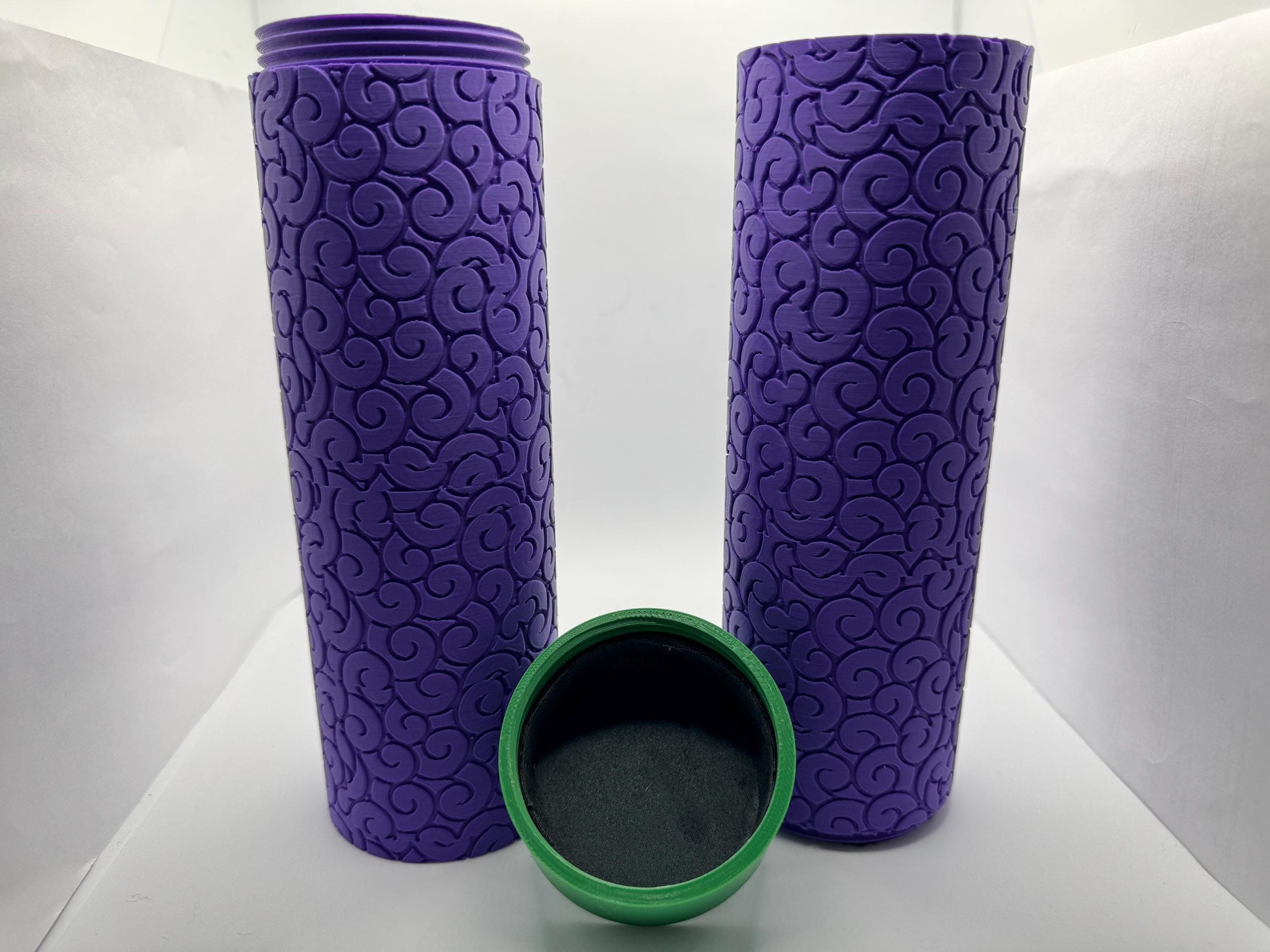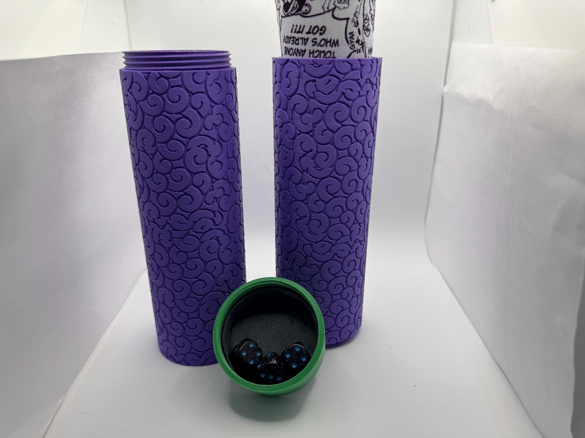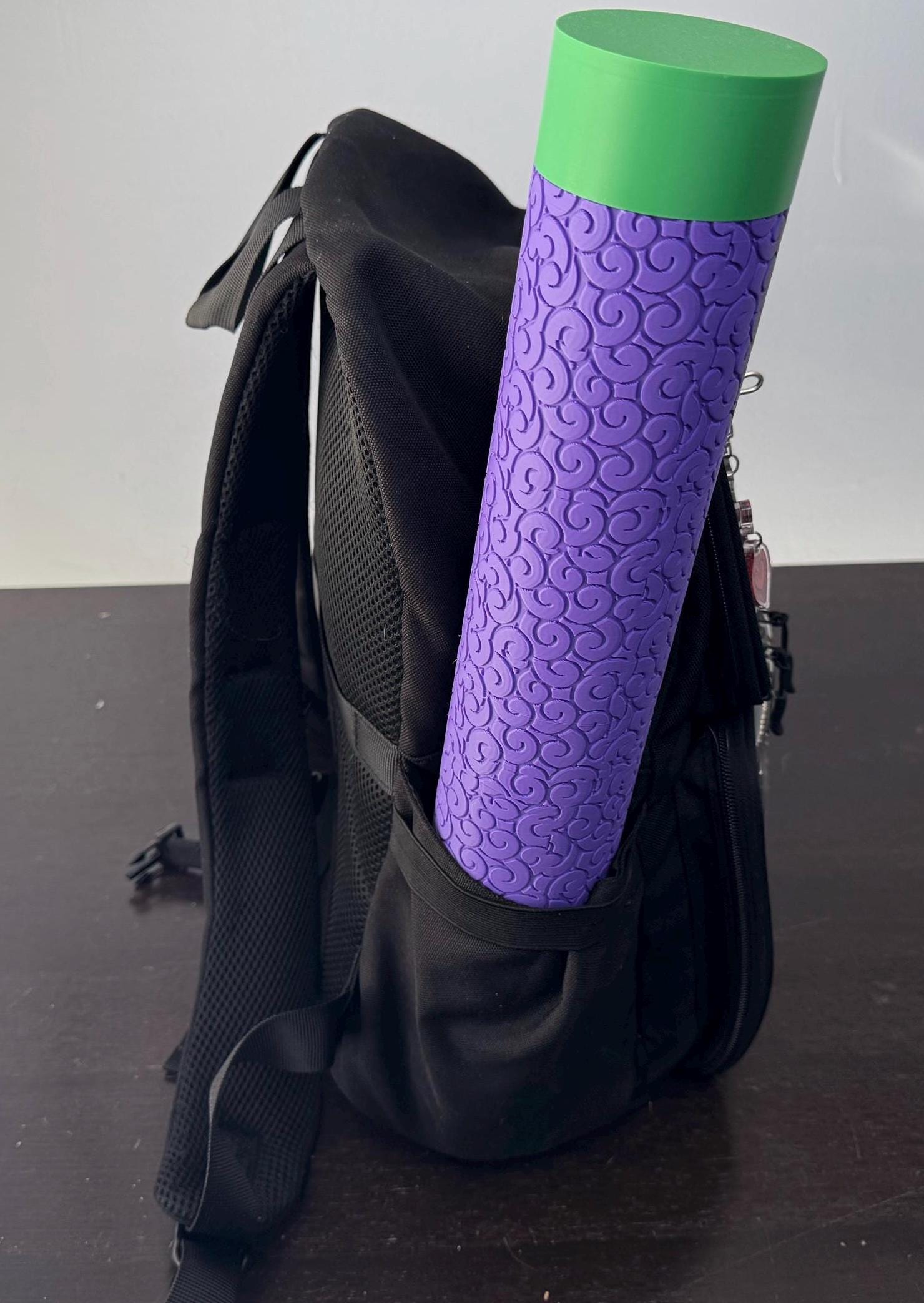 This devil fruit inspired playmat tube holds standard size mats (24” x 14”) and has a separate dice storage. The dice storage is lined with faux suede to reduce the noice of dice movement during travel. Fits most backpack water bottle pockets!
